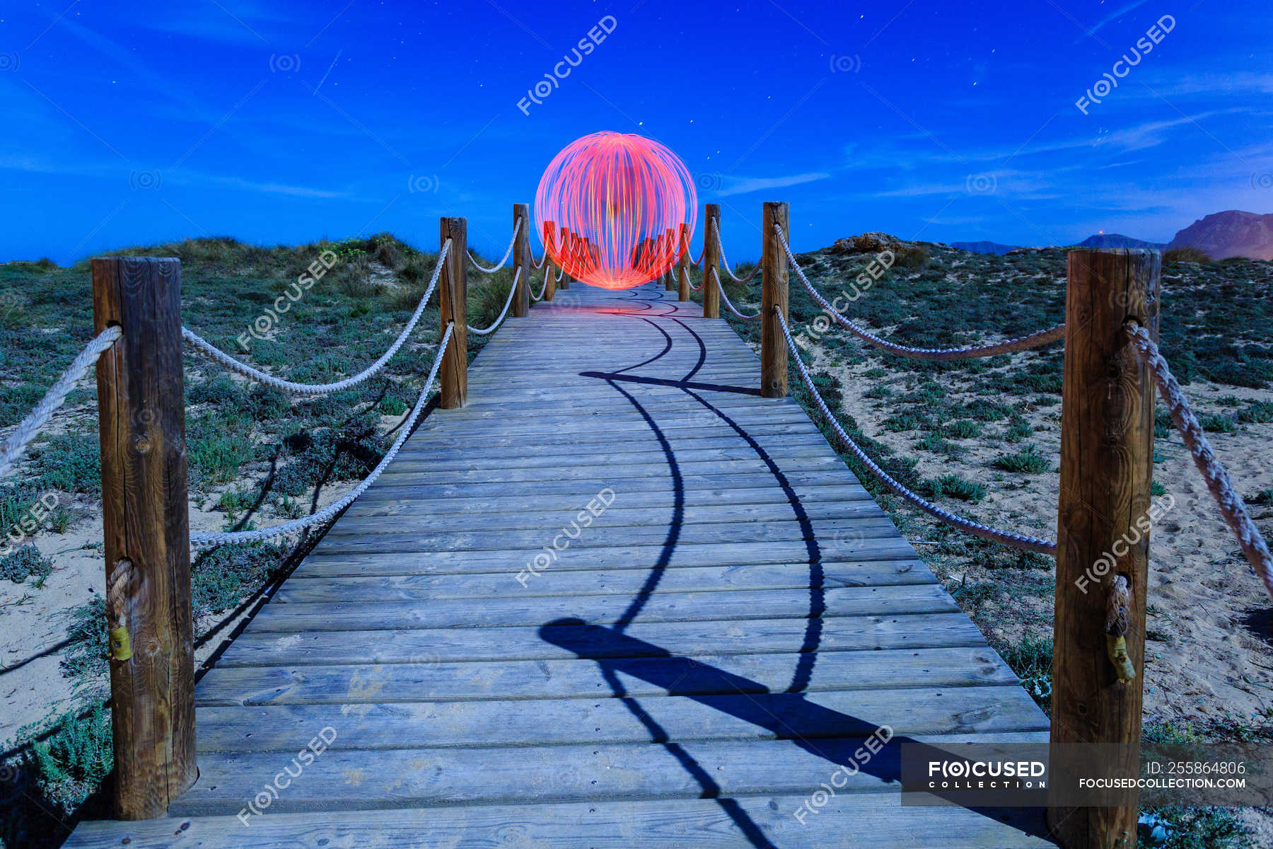 White Abstract Sphere Levitating Above Footbridge Between Lands And Blue Sky In Evening Countryside Red Stock Photo 255864806